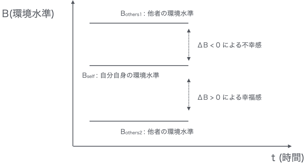 この図は、自分の環境水準と他者の環境水準を見比べることで生まれる幸福や不幸を示しています。横軸を時間、縦軸を環境水準とし、他者の水準が自分より上なら「うらやましさ」や「焦り」を感じたり、逆に下なら「優越感」や「安心」を覚えたりするわけです。