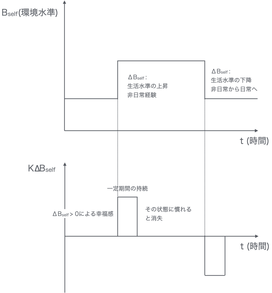環境水準(Bself)が一時的に上昇すると、最初は強い幸福感が生まれるものの、やがて慣れによって日常に戻る様子を示しています。たとえば昇給や新居への引っ越しでは、しばらくはワクワクが続きますが、時間が経つとその特別感が薄れて“当たり前”になってしまうわけです。反対に、環境水準が急に下がると一時的に大きなストレスを感じますが、これもいずれ新しい状態に慣れていきます。